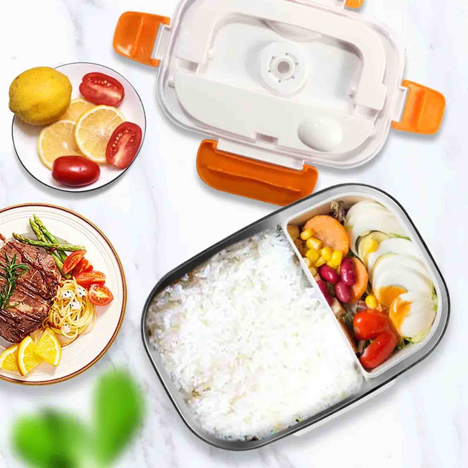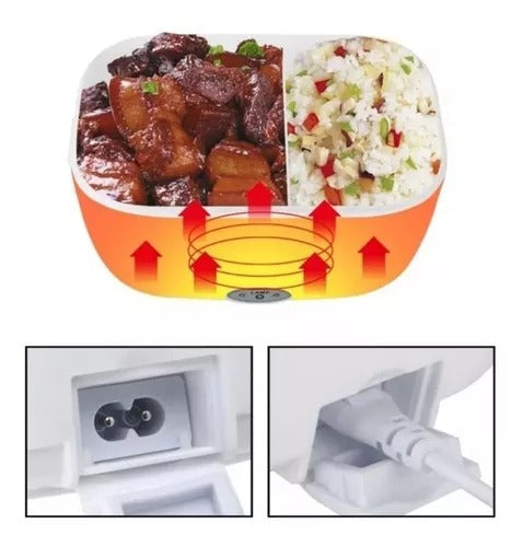 Fiambrera eléctrica portátil diseñada para recalentar comidas sobre la marcha. Con capacidad de 1,5L y potencia de 40W, calienta alimentos a 50-60°C en aproximadamente 30 minutos mediante tecnología PTC de temperatura constante. Construida en polipropileno de grado alimentario, incluye compartimentos separables con junta de silicona hermética, asa ergonómica y cuchara. Dimensiones: 23 x 16 x 10 cm. Ideal para oficina, viajes o actividades al aire libre. Mantiene el calor hasta 15 minutos después de apagar. No apta para microondas ni inmersión en agua. Garantía de 10 días.