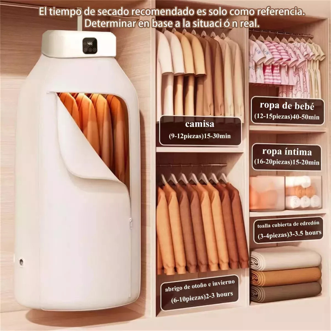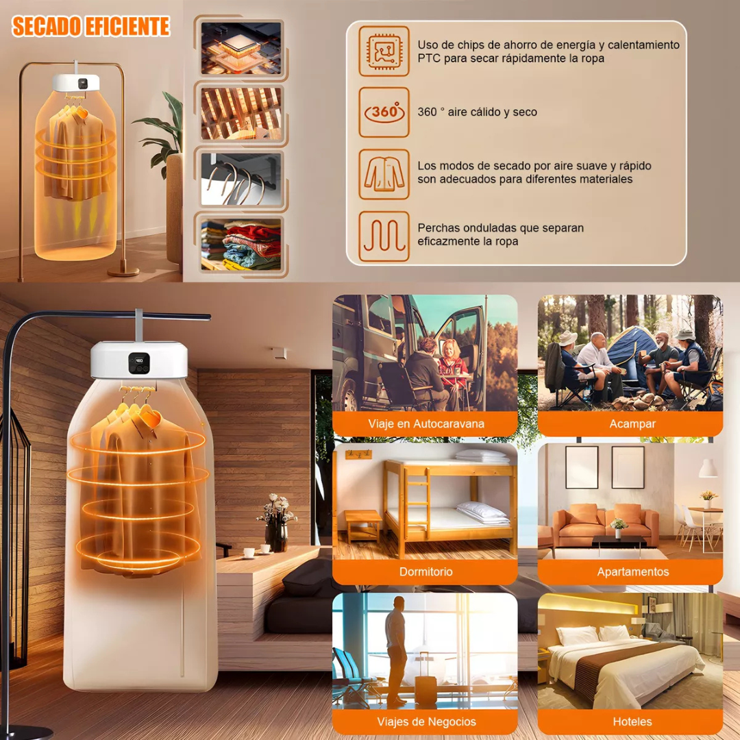 Secadora portátil y plegable diseñada para ofrecer versatilidad en espacios reducidos. Cuenta con dos modos de secado ajustables—suave para prendas delicadas y rápido para tejidos resistentes—controlables mediante un solo botón. La bolsa ignífuga de 38 pulgadas proporciona protección térmica, mientras que el apagado automático garantiza seguridad operativa. Incorpora temporizador programable de 1 a 8 horas y luz UV azul para desinfección. Su estructura compacta (12" x 8" x 4") se pliega fácilmente, haciéndola ideal para apartamentos, viajes o uso temporal. Funciona silenciosamente y consume energía de forma optimizada. Incluye control remoto, bolsa plegable y manual de configuración rápida. Apta para ropa, calzado y artículos de bebé.